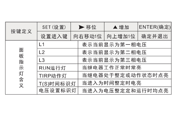 , 無數(shù)值顯示。繼電器達到所設定值,動作后,由TIRP動作燈會點亮,實際線路電壓低于或高于所設定的返回值,指示燈切換回來。正常運行情況下,RUN運行燈、電壓設置表示燈常亮。L1、L2、L3來回切換運行。當輸入電壓任意一相滿足動作條件,繼電器動作,電壓標識燈熄滅,表示延時時間已到動作。當輸入接近動作條件時,繼電器進入動作預備狀態(tài),所有芯片資源用來計算輸入值,一旦滿足條件,立即啟動計時,繼電器設有啟動量連續(xù)判斷功能和突變量連續(xù)判斷功能,能夠有效迅速的判斷輸入值,并躲過短時干擾。