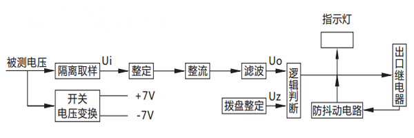被測(cè)電壓經(jīng)過(guò)電阻分壓取樣,得到與被測(cè)電壓成比例的取樣電壓Ui,Ui經(jīng)撥盤(pán)整定,再進(jìn)行整流濾波,得到直流Uo,邏輯回將Uo 與門(mén)坎電壓Uz進(jìn)行比較。對(duì)欠電壓繼電器,若Uo>Uz,則出口繼電器不動(dòng)作;若Uo<Uz,則出口繼電器動(dòng)作。對(duì)過(guò)電壓繼電器,若 Uo<Uz,則出口繼電器不動(dòng)作;若Uo>Uz,則出口繼電器動(dòng)作。
