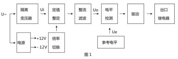 本繼電器為靜態(tài)型繼電器,采用進(jìn)口集成電路構(gòu)成,被測量的交流電壓U~經(jīng)隔離變壓器降壓后得到與被測電壓成正比的電壓Ui,經(jīng) 整定后進(jìn)行整流,整流后脈沖電壓經(jīng)濾波器濾波,得到與Ui成正比的直流電壓Uo,在電平檢測中Uo與直流參考電壓 Ue 進(jìn)行比較,若直流 電壓Uo低于參考電壓,電平檢測器輸出正信號,驅(qū)動出口繼電器,則本繼電器處于動作狀態(tài)。反之,不論是過電壓繼電器或是低電壓繼電器, 若直流電壓Uo高于參考電壓 Ue,電平檢測器輸出負(fù)信號,本繼電器處于不動作狀態(tài)。