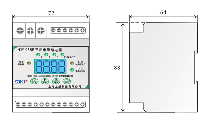 , 無數值顯示。繼電器達到所設定值,動作后,由TIRP動作燈會點亮,實際線路電壓低于或高于所設定的返回值,指示燈切換回來。正常運行情況下,RUN運行燈、電壓設置表示燈常亮。L1、L2、L3來回切換運行。當輸入電壓任意一相滿足動作條件,繼電器動作,電壓標識燈熄滅,表示延時時間已到動作。當輸入接近動作條件時,繼電器進入動作預備狀態,所有芯片資源用來計算輸入值,一旦滿足條件,立即啟動計時,繼電器設有啟動量連續判斷功能和突變量連續判斷功能,能夠有效迅速的判斷輸入值,并躲過短時干擾。