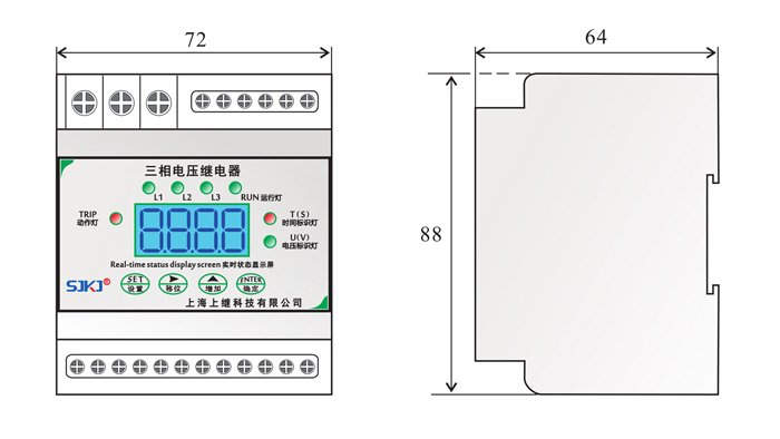 , 無數(shù)值顯示。繼電器達(dá)到所設(shè)定值,動作后,由TIRP動作燈會點亮,實際線路電壓低于或高于所設(shè)定的返回值,指示燈切換回來。正常運行情況下,RUN運行燈、電壓設(shè)置表示燈常亮。L1、L2、L3來回切換運行。當(dāng)輸入電壓任意一相滿足動作條件,繼電器動作,電壓標(biāo)識燈熄滅,表示延時時間已到動作。當(dāng)輸入接近動作條件時,繼電器進(jìn)入動作預(yù)備狀態(tài),所有芯片資源用來計算輸入值,一旦滿足條件,立即啟動計時,繼電器設(shè)有啟動量連續(xù)判斷功能和突變量連續(xù)判斷功能,能夠有效迅速的判斷輸入值,并躲過短時干擾。